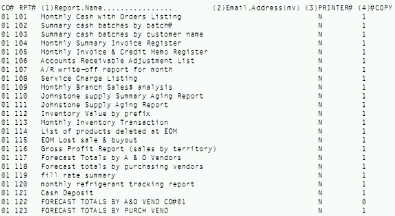 3. Go into menu 16.5 "EOD Report Xref Maintenance". Enter the report you selected i.e. 01-126 (01 is the company 1 and 126 is the report number). It will show up as follows: