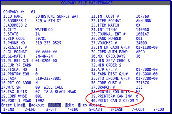 If Line 40 is Y for yes, when an invoice is cancelled it will print a copy of the cancelled invoice with a VOID watermark across the invoice. It will print to the laser printer your terminal is assigned to. Line 39 (Printer# Can Inv) becomes inactive at the time you go onto signature capture. N for no will turn this option off. Leaving this field blank will default to no.